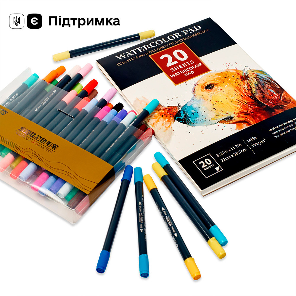 Акварельні маркери для малювання з м'яким пензлем 48 шт. + Акварельний папір 20 л, великий набір для малювання